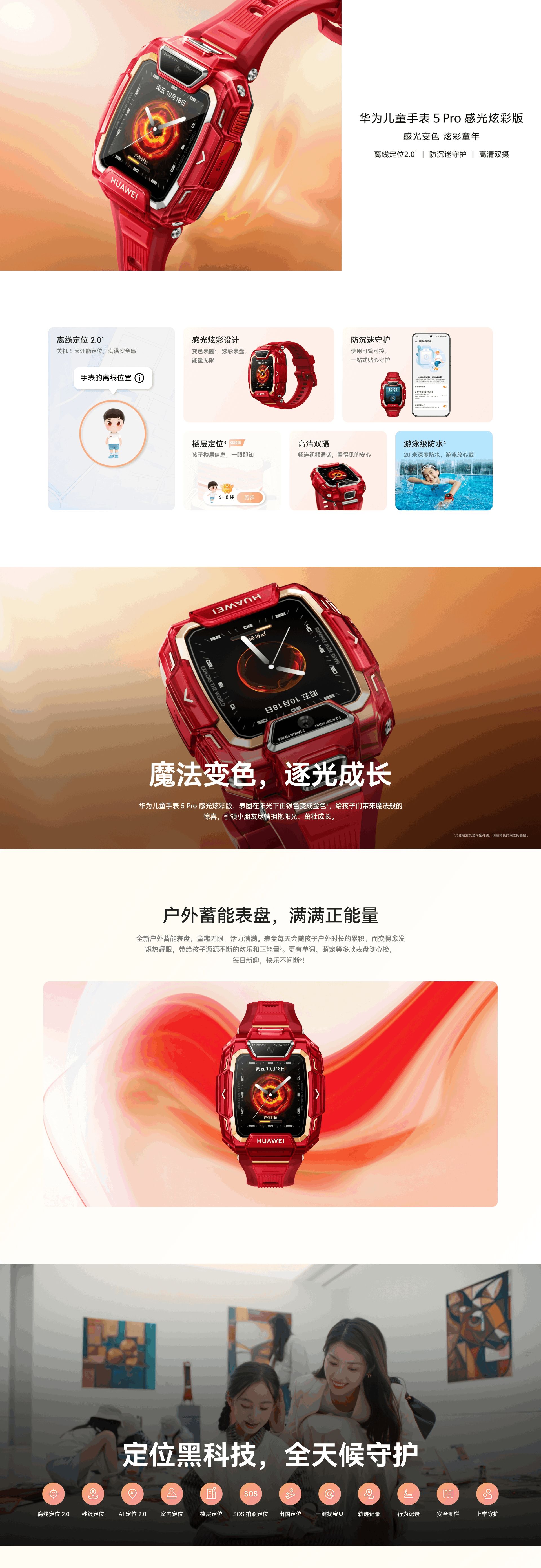 华为儿童手表 5 Pro 感光炫彩版 TGR-L10(红色硅胶表带).赤焰红