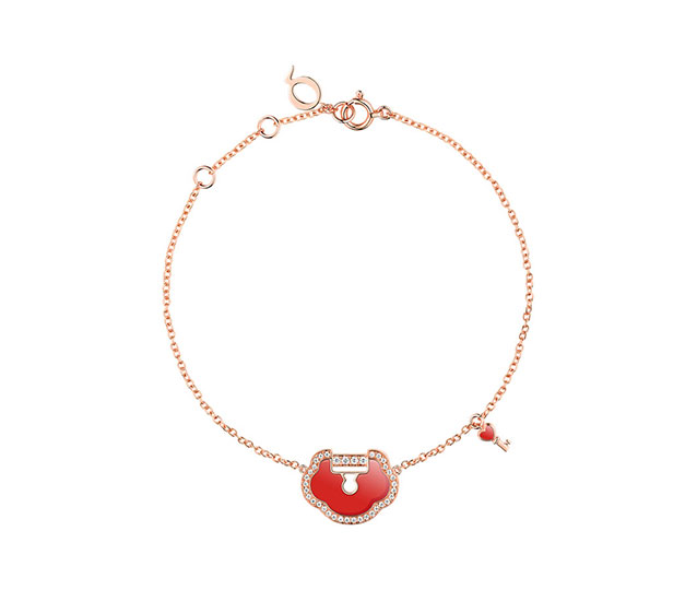 Qeelin Yu Yi Lock 18K玫瑰金钻石及红玛瑙手链