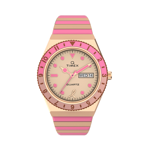 这款腕表为天美时x BCRF系列带来了潜水灵感Q的持久力。36毫米玫瑰金调表壳突出了醒目的粉色表盘,突出了日期窗口,粉色的扫手和标志性的乳腺癌丝带在6点钟的标记。这款手表的灵感来自于我们从石英时代开始的档案设计,它保留了许多在20世纪70年代赢得数百万人心的原始细节:旋转表圈、功能电池口和圆顶丙烯酸晶体。一个容易调节的完美Fit™膨胀带提供了一个适合你会喜欢的,而它的粉红色和玫瑰金色调的配色把注意力放在手腕和意识到原因。